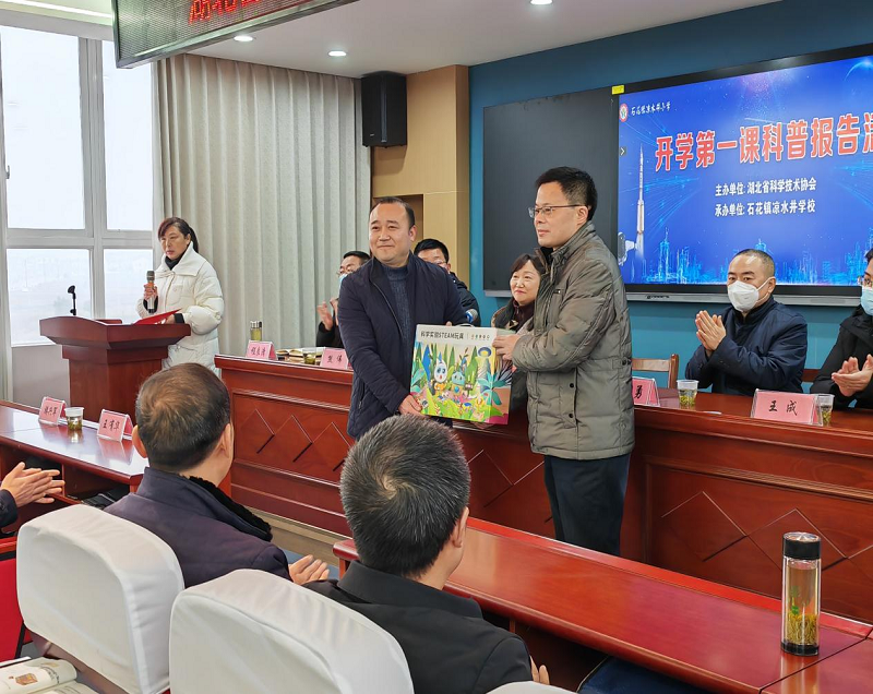 在開(kāi)課儀式前,首先由省青少年科技中心靖春元主任宣讀了《省科協(xié)關(guān)于公布2023年湖北省特色產(chǎn)業(yè)科普基地和基層科普服務(wù)能力提升行動(dòng)計(jì)劃項(xiàng)目的通知》,隨后王新云副主席為涼水井小學(xué)頒發(fā)“湖北省科普教育學(xué)校”獎(jiǎng)牌,并向涼水井小學(xué)捐贈(zèng)了485套科普活動(dòng)資源包。在科普?qǐng)?bào)告會(huì)上,襄陽(yáng)市氣象臺(tái)臺(tái)長(zhǎng)王成為學(xué)生作了以《走近氣象 認(rèn)識(shí)預(yù)報(bào)》為主題的科普?qǐng)?bào)告,從認(rèn)識(shí)天氣預(yù)報(bào)、用好天氣預(yù)報(bào)、認(rèn)識(shí)預(yù)警信號(hào)、防災(zāi)避險(xiǎn)知識(shí)等方面做了詳盡的介紹。