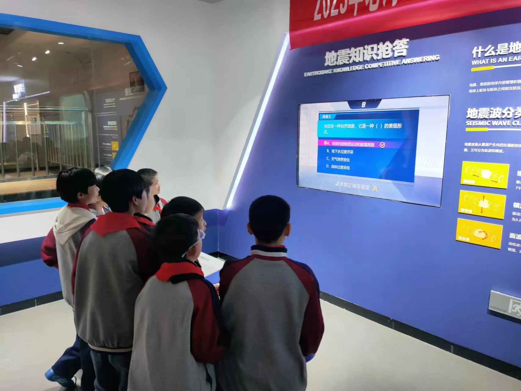 活動現(xiàn)場,科技館工作人員以圖片和知識搶答的形式,為竹林橋小學四年級的學生們科普了防災減災日的由來,以及地震、火災、臺風、洪澇、雷電等災害知識和防范應對基本技能。