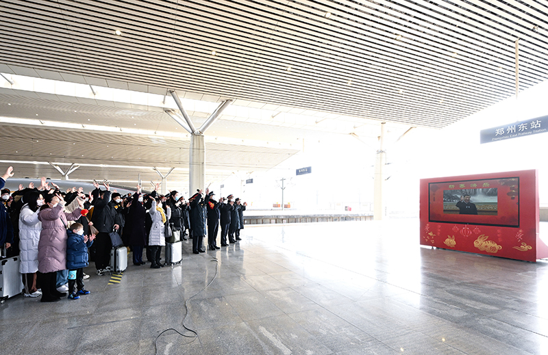 鄭州東站是我國最大的高鐵站之一,今年春運(yùn)期間預(yù)計(jì)旅客發(fā)送量337萬人。習(xí)近平通過視頻連線看望慰問鐵路客運(yùn)干部職工。在東站一站臺,鄭州東站站長匯報(bào)車站春運(yùn)總體情況。習(xí)近平又詳細(xì)詢問車站現(xiàn)在每天的客流量是多少?防疫措施落實(shí)得怎么樣?春運(yùn)治安采取了哪些措施?囑咐他們精心組織調(diào)度,嚴(yán)守安全底線,確保廣大旅客安全出行。月臺上的旅客看見總書記,爭相趕到鏡頭前,向總書記問好。習(xí)近平親切詢問他們是回家過年還是外出旅游,叮囑他們注意旅途安全。習(xí)近平指出,春運(yùn)是關(guān)系人民群眾切身利益、關(guān)系經(jīng)濟(jì)發(fā)展和社會穩(wěn)定的一件大事。今年春運(yùn)是疫情防控進(jìn)入新階段后的第一個(gè)春運(yùn),客流量大幅回升。交通運(yùn)輸部門要堅(jiān)決貫徹落實(shí)黨中央要求,提升保通保暢能力,確保人民群眾平安健康出行,確保重點(diǎn)物資運(yùn)輸暢通有序。要堅(jiān)持底線思維,加強(qiáng)對極端惡劣天氣的監(jiān)測和預(yù)警,深入開展安全隱患排查治理,堅(jiān)決遏制重特大安全事故發(fā)生。要加強(qiáng)對出行相對集中的務(wù)工流、學(xué)生流的服務(wù)引導(dǎo),確保他們節(jié)前安全返鄉(xiāng)、節(jié)后順利返崗返校。要嚴(yán)格落實(shí)各項(xiàng)防控規(guī)定,最大限度降低交叉感染幾率,保障旅客身體健康。習(xí)近平強(qiáng)調(diào),長期以來,交通運(yùn)輸系統(tǒng)的干部職工埋頭苦干,擔(dān)當(dāng)奉獻(xiàn),功不可沒。春節(jié)期間,許多同志要堅(jiān)守崗位。習(xí)近平代表黨中央,向交通運(yùn)輸系統(tǒng)的廣大干部職工致以新春的祝福,并祝廣大旅客旅途順利。
