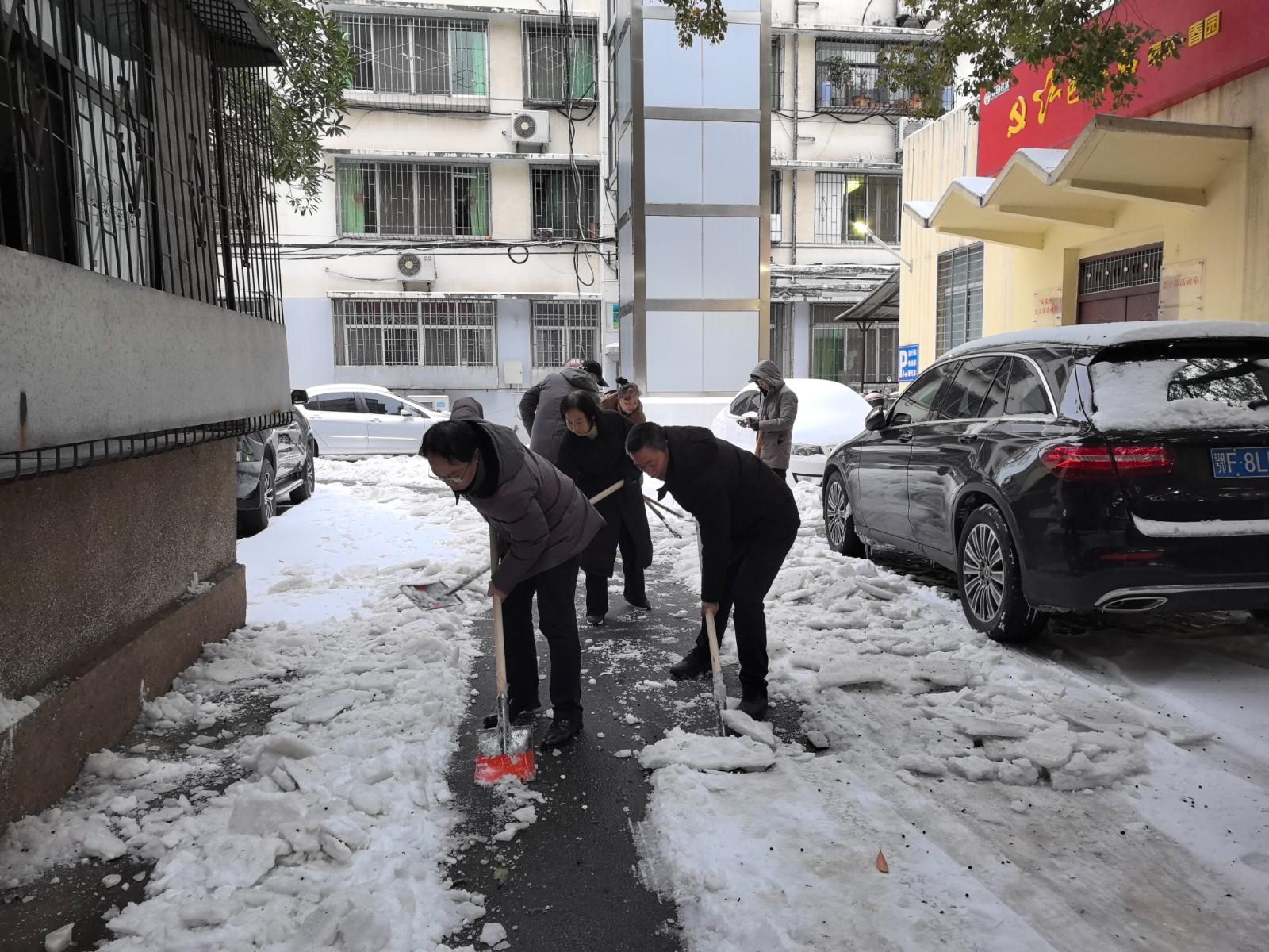 現(xiàn)場如火如荼,黨員干部們紛紛手持鐵鍬、掃帚,團(tuán)結(jié)協(xié)作、密切配合,退休老黨員和居民也自發(fā)參與其中。隨著一聲聲清脆的鏟冰除雪聲,將院內(nèi)和道路積雪積冰清理干凈,熱火朝天奏響了一首掃雪除冰“進(jìn)行曲”,身心投入為群眾掃出一條“平安路”。