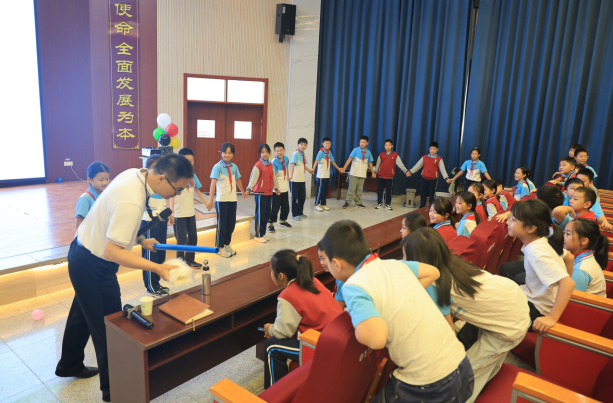 在高新區(qū)鄧城小學(xué)的報(bào)告廳內(nèi),楊教授以輕松幽默的互動(dòng)方式,帶領(lǐng)同學(xué)們開啟了一段奇妙的靜電探索之旅。在“千人震”實(shí)驗(yàn)中,多名同學(xué)手拉手組成“電流通道”,親身感受到靜電接連傳遞帶來的輕微震顫,現(xiàn)場(chǎng)驚呼與笑聲不斷。隨后,楊教授又依次演示了“噴氣式氣球火箭”“反彈式氣球火箭”和“氣動(dòng)紙火箭”三種實(shí)驗(yàn),引導(dǎo)大家仔細(xì)觀察不同火箭的飛行軌跡與特點(diǎn)。同學(xué)們?cè)跉g快的氣氛中,不僅直觀理解了反沖作用與空氣動(dòng)力等基本原理,更在親手體驗(yàn)和主動(dòng)發(fā)問中,真切感受到科學(xué)無處不在的魅力。