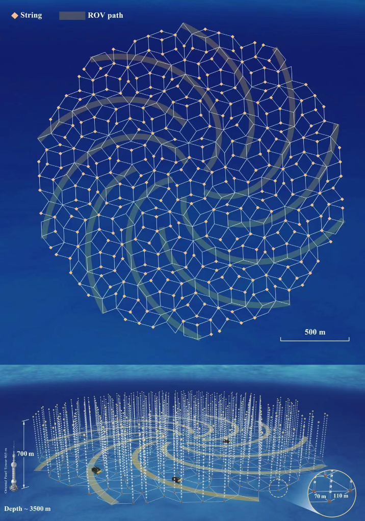 海鈴計劃構(gòu)想圖。陣列成潘路斯(Penrose)密鋪幾何,約有1200條垂直線纜,每條線纜上約有20個光學(xué)模塊,線纜位于海洋下方約3500米深處,監(jiān)測體積為 (4 x 4 x 0.5) 立方公里
